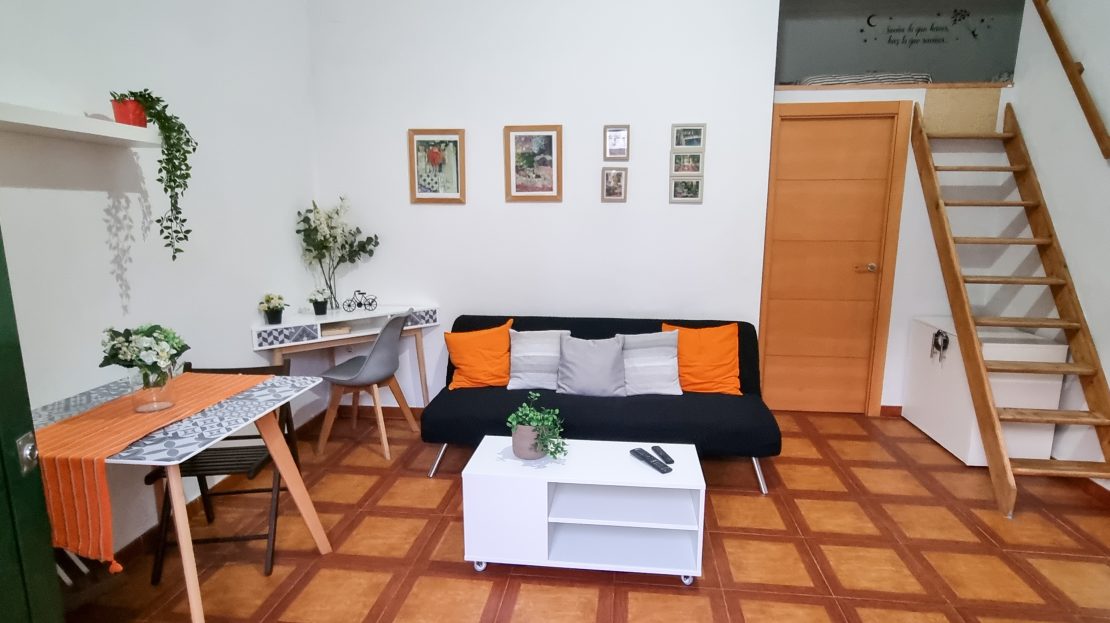 – Salón con aire acondicionado, sofa-cama, almacenamiento y suelo de terracota