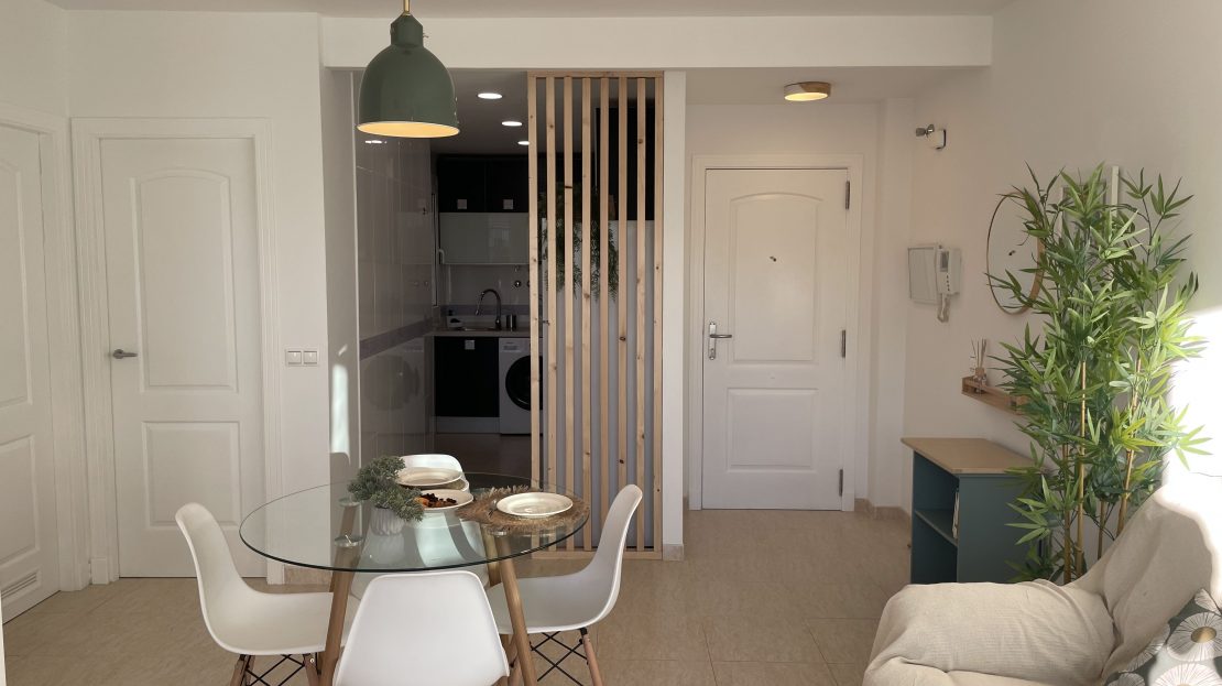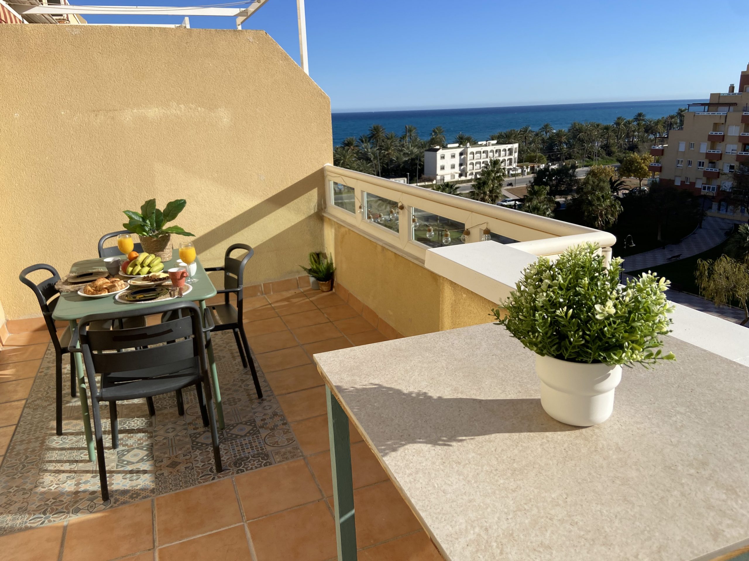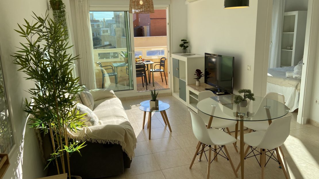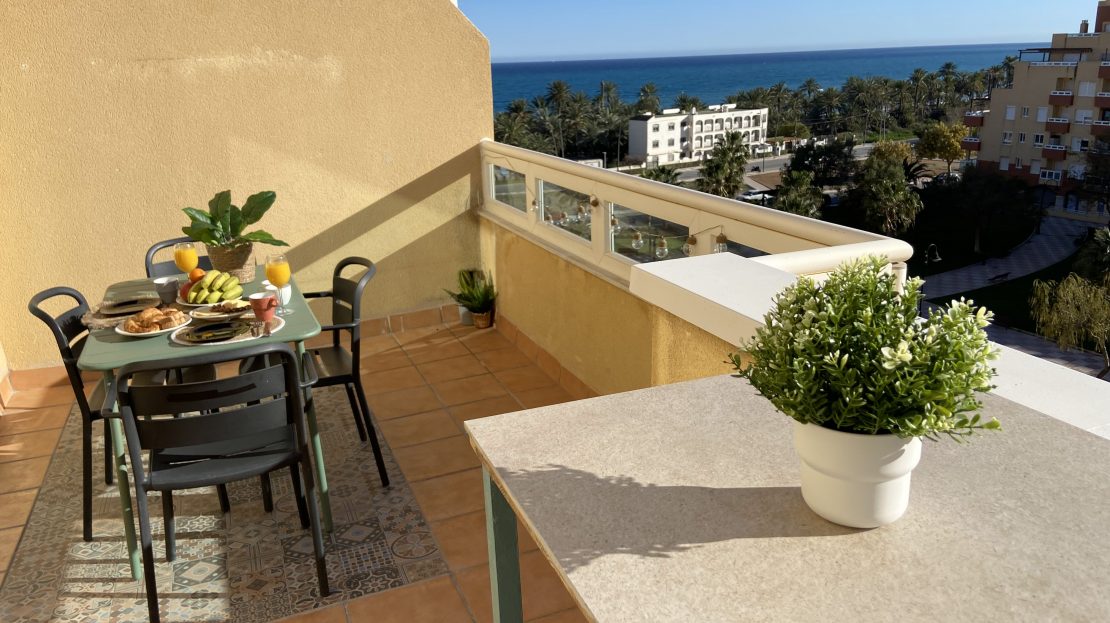 Es un semi-ático en 2ª línea de playa con una terraza enorme con unas vistas espectaculares al mar. Está a pocos metros del CEIP Torrequebrada y a 50m de la playa. Recién reformado, los muebles son la mayoría nuevos y de diseño. Dispone de 2 habitaciones, una grande con cama de matrimonio KingSize de 150cm, y otra con cama nido y capacidad para 2 personas más. Dispone de un baño totalmente nuevo, cocina abierta al salón totalmente equipada (lavadora, horno, frigo, microondas, cafetera, hervidor y todo el menaje de cocina) , salón con Aire acondicionado y sofá a estrenar. Piscina comunitaria con socorrista (Junio, Julio y Agosto), zona juegos infantil rodeada de zonas verdes. Dispone de plazas de aparcamiento de la comunidad para aparcar en la puerta sin problema.