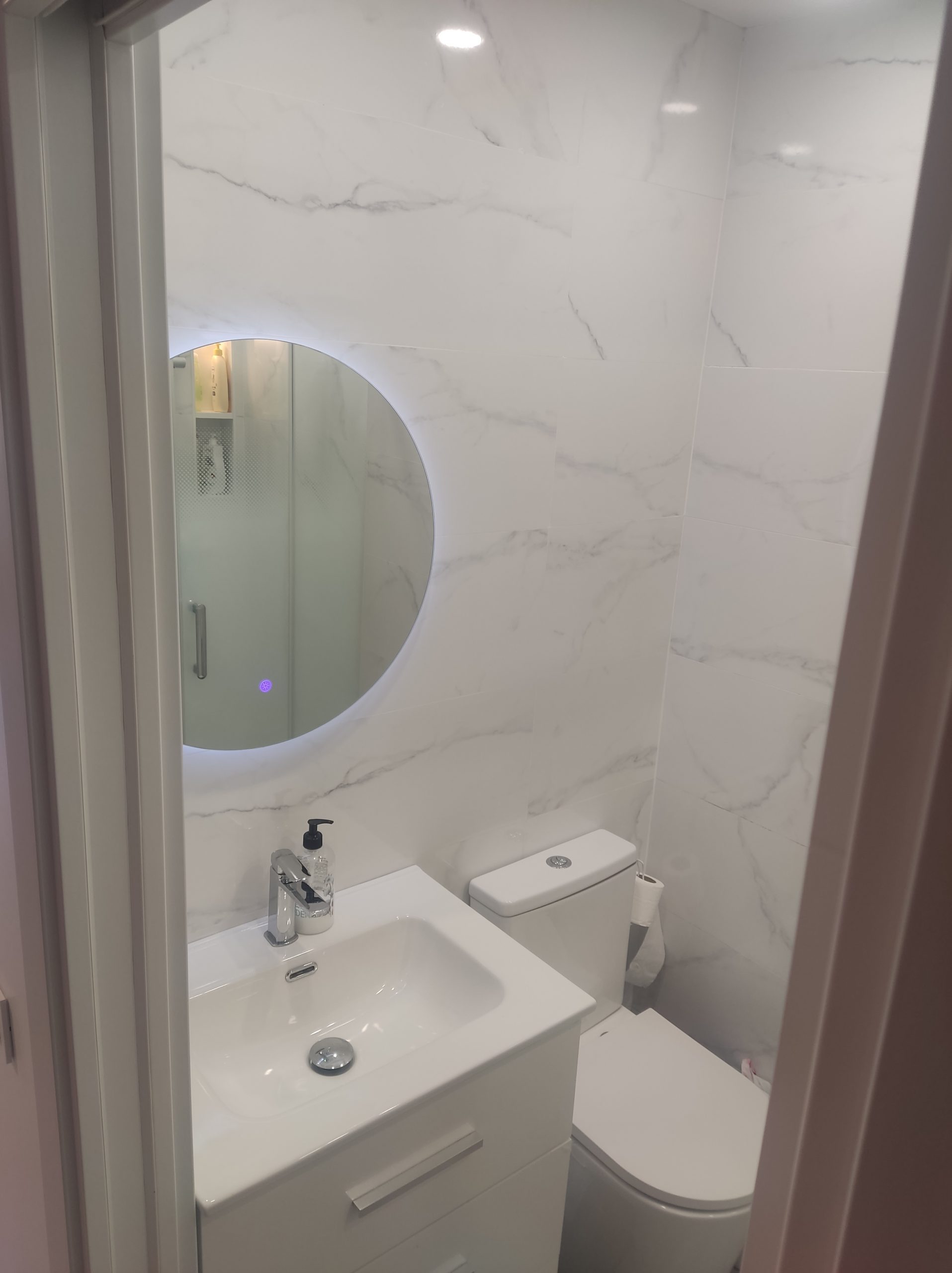 Baño con placa de ducha amplia, lavadora, mueble con cajoneras bajo el lavabo, termo de agua cliente y extractor silencioso. Completo con todo lo necesario para un baño, con distintos tipos de iluminación.