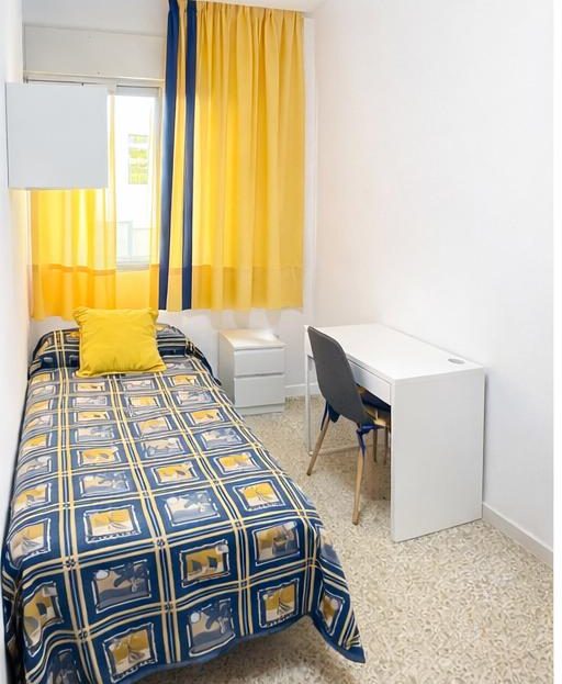 La habitación es interior, lo que la hace muy silenciosa y perfecta para descansar o estudiar, y está bien aprovechada, con espacio funcional para cama, armario y zona de trabajo. Es una estancia recogida y cómoda, pensada para quien busca practicidad y calma.