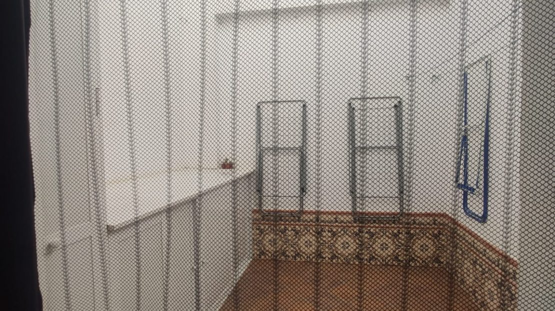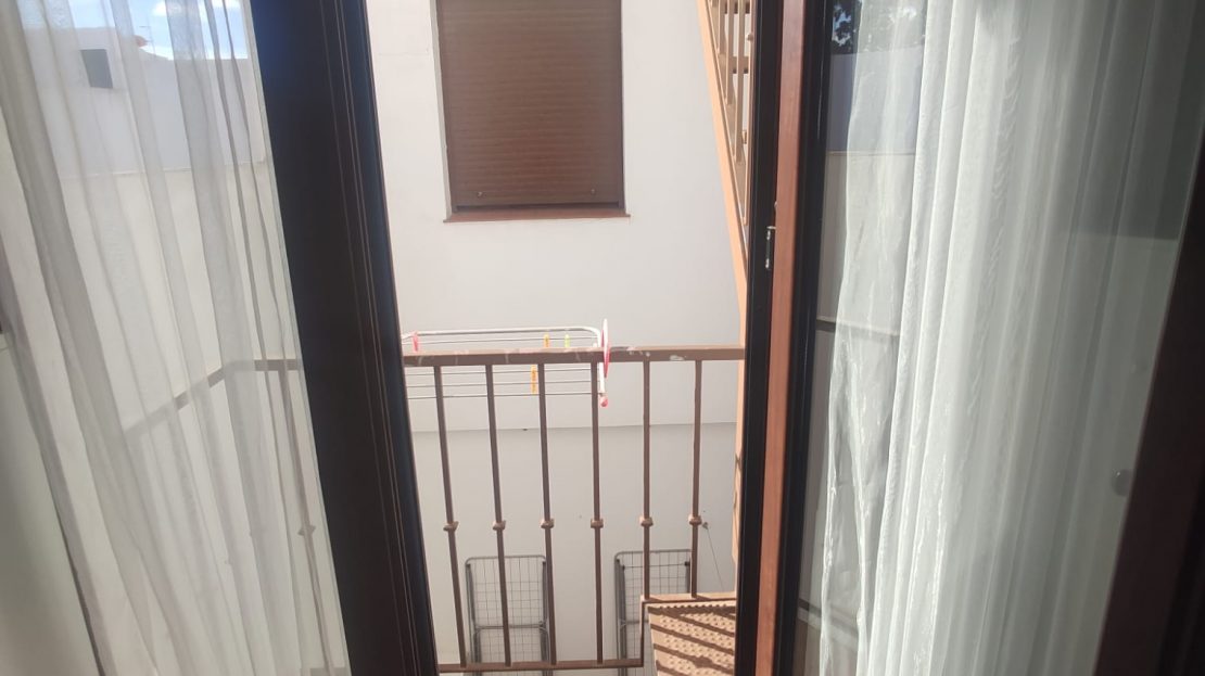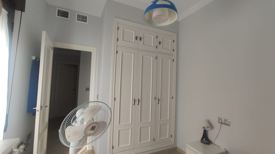 La habitación consta de cama (canapé), armario empotrado con artillo, mesita de noche, cómoda y balcón al patio.